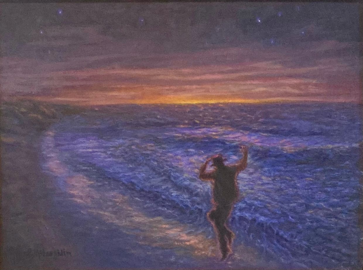 Walking on the beach in Dana Point, CA, I saw this young boy splashing along the shore in his street clothes. I then saw the lady sitting back on the sand, watching him. I introduced myself, and she gave me permission to snap a couple of photos of her son for my next painting. My camera caught him in a moment of reverie, and it became the reference for this painting. Pure spontaneity — his shoes soaking wet.